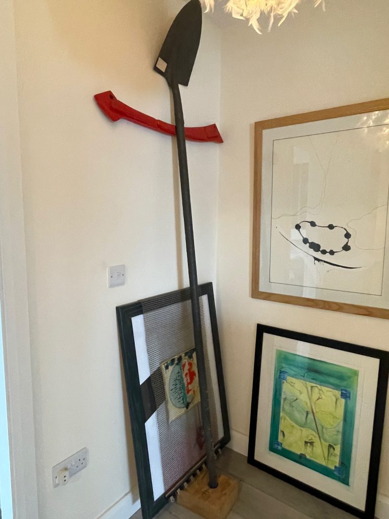 Today, on a misty late August afternoon, I arrive at his door to interview him and to take a peek. No clues from the outside. He opens the door, relaxed and welcoming, wearing a flowing white shirt, light baggy trousers and chunky sandals. ‘Come in. Come in.’ I follow him down the hall, clocking an oversize shovel standing sentry like at the top of the stairs.