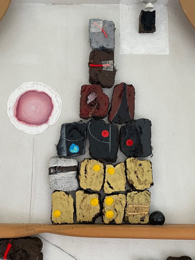 I do not know how best to describe it; it has to be experienced. If I stand in the middle of the room and view in all directions I can take in each detail. His turf sculptures excite me the most. On bespoke shelves he has arranged small slices of turf, each the thickness of a slice of swiss roll. These are neatly stacked on top of each other to form temples or Monuments, each slice painted silver halfway up the sides with an added bright yellow spot. Totally unique and arresting. They made me snigger. He chuckled in response.