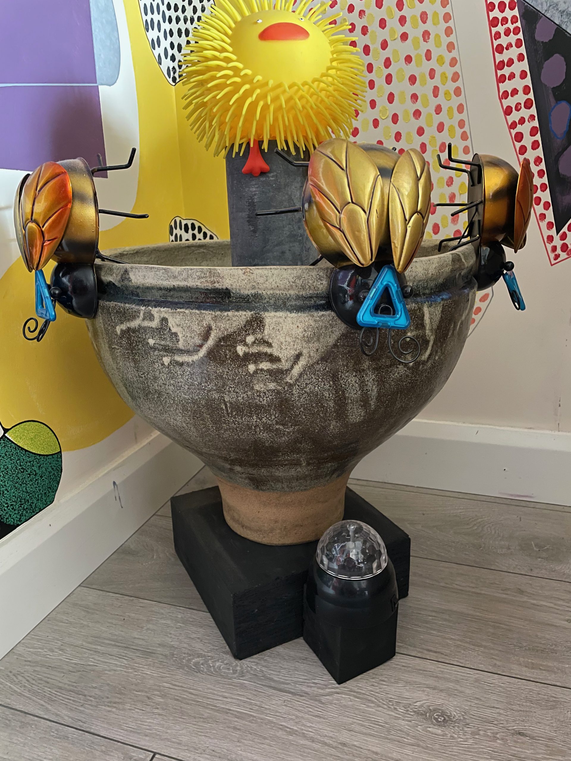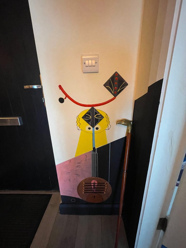 We move to the living room. This impressive pot sits in the corner, on a new plinth with colourful objects placed on top. All of the walls have drawings that are directly on the wall with vibrantly coloured sculptures positioned high and low. Each is a playful response to the one next to it and on it goes. A never-ending artwork. This living room is an enclosed space and is now complete.