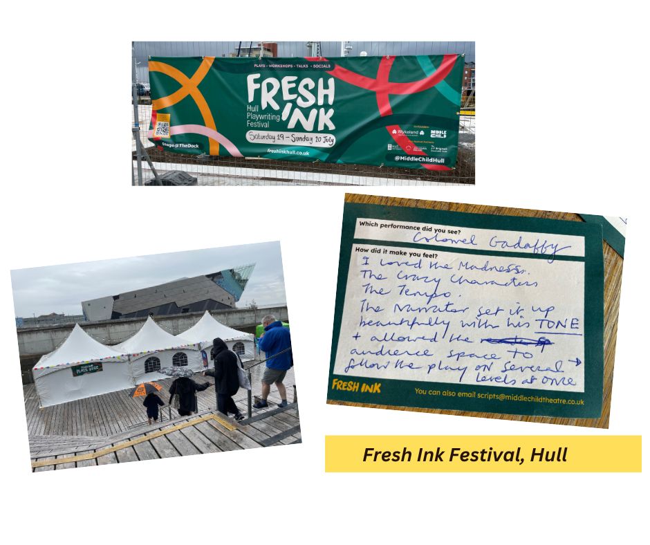 A chance invitation to Hull in the UK coincided with the Fresh Ink Playwrighting Festival, over one weekend 17-19 July. In a Marquee on the docks, in torrential rain, this was ‘Fresh’ indeed. Middle Child Theatre company gave spirited readings of 8 plays at various stages of development, some on second draft, some on eighth and some reappearing. In the audience sat the writers, dramaturgs, theatre makers, and creatives. This was an immersive experience where each attendee watched all plays and was encouraged to give feedback.