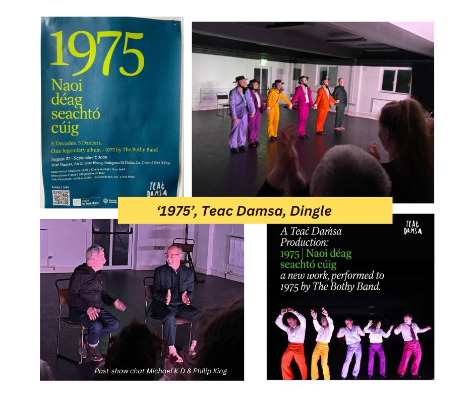 The dancers rose and fell with the rhythms and stepped out or sat when spent, just as a dancer would do at a céilí, only to run back in to re-join the energy. Dressed in bright Jellybean coloured suits they startled the audience in this tiny Teach Damhsa rehearsal studio. We were rattled and shook, sitting at close proximity. There were wild storms battering West Kerry. This was a storm on the inside. This show will tour. Watch out for it. So glad I went.
