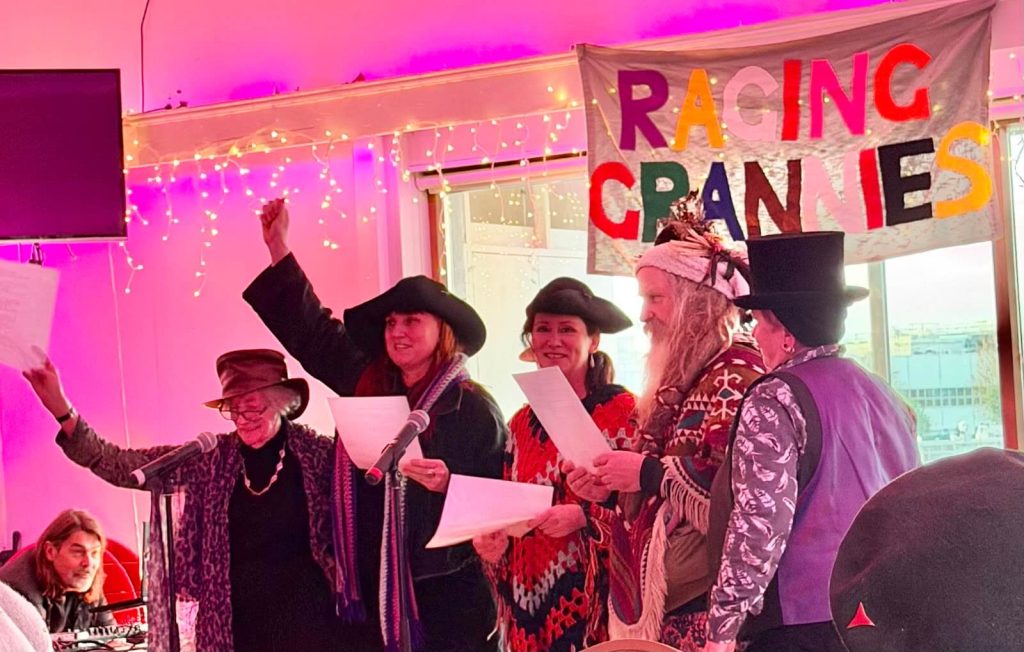 True to form, it was chaotic and anarchic. No-one was sure what time proceedings would begin nor who would lead them. Artists and friends, young and very old poured in and everyone had something to contribute. Poet Sarah Clancy became a last minute MC and things got underway.